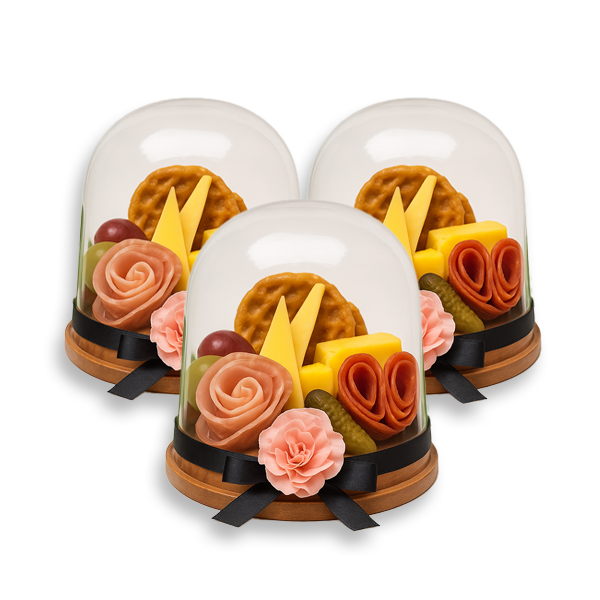 Individual servings of charcuterie in sophisticated dome packaging. These domes include: havarti, gouda, colby jack, prosciutto, salami, pepperoni, crackers, fruit, dark chocolate, and olives